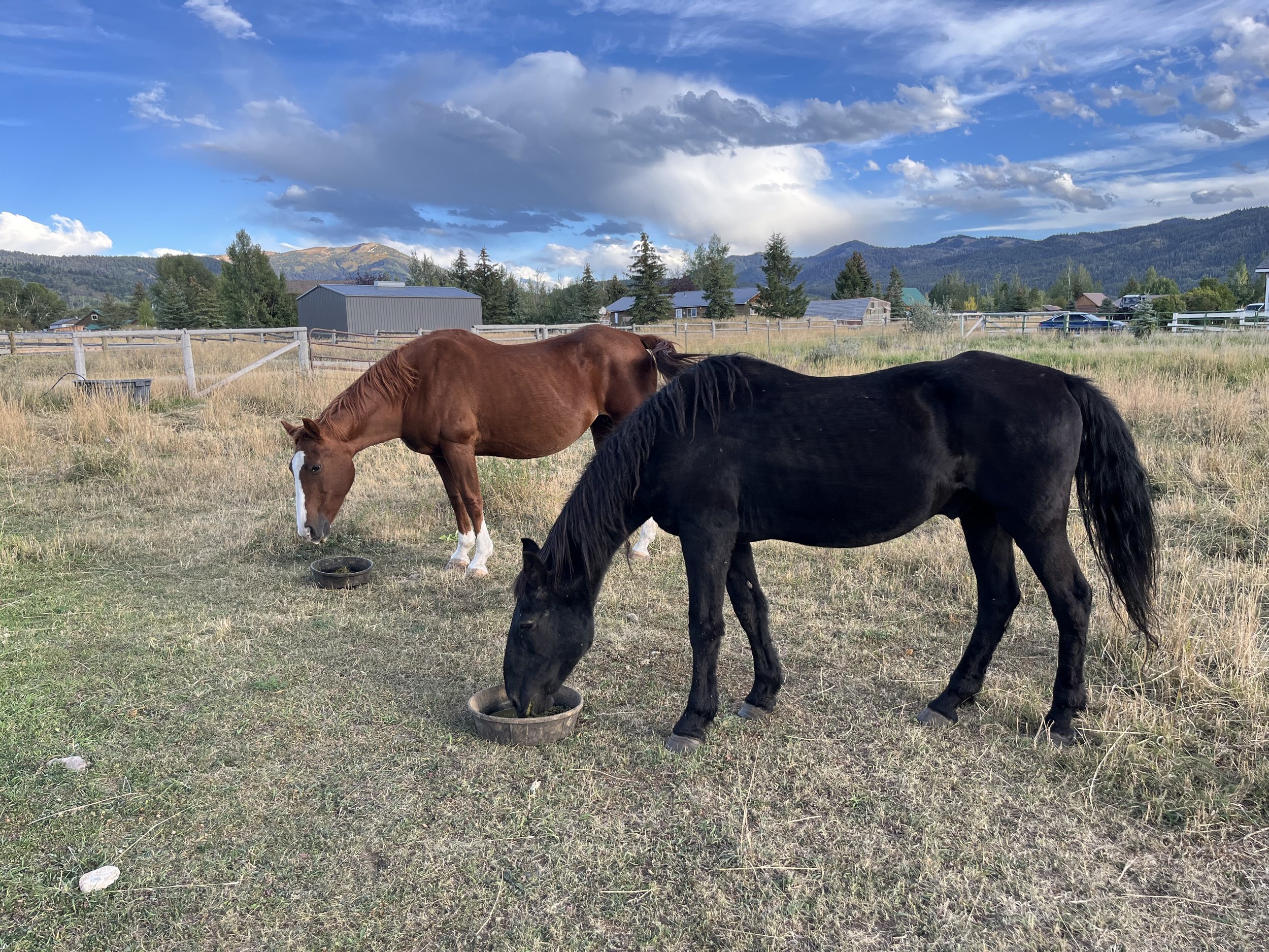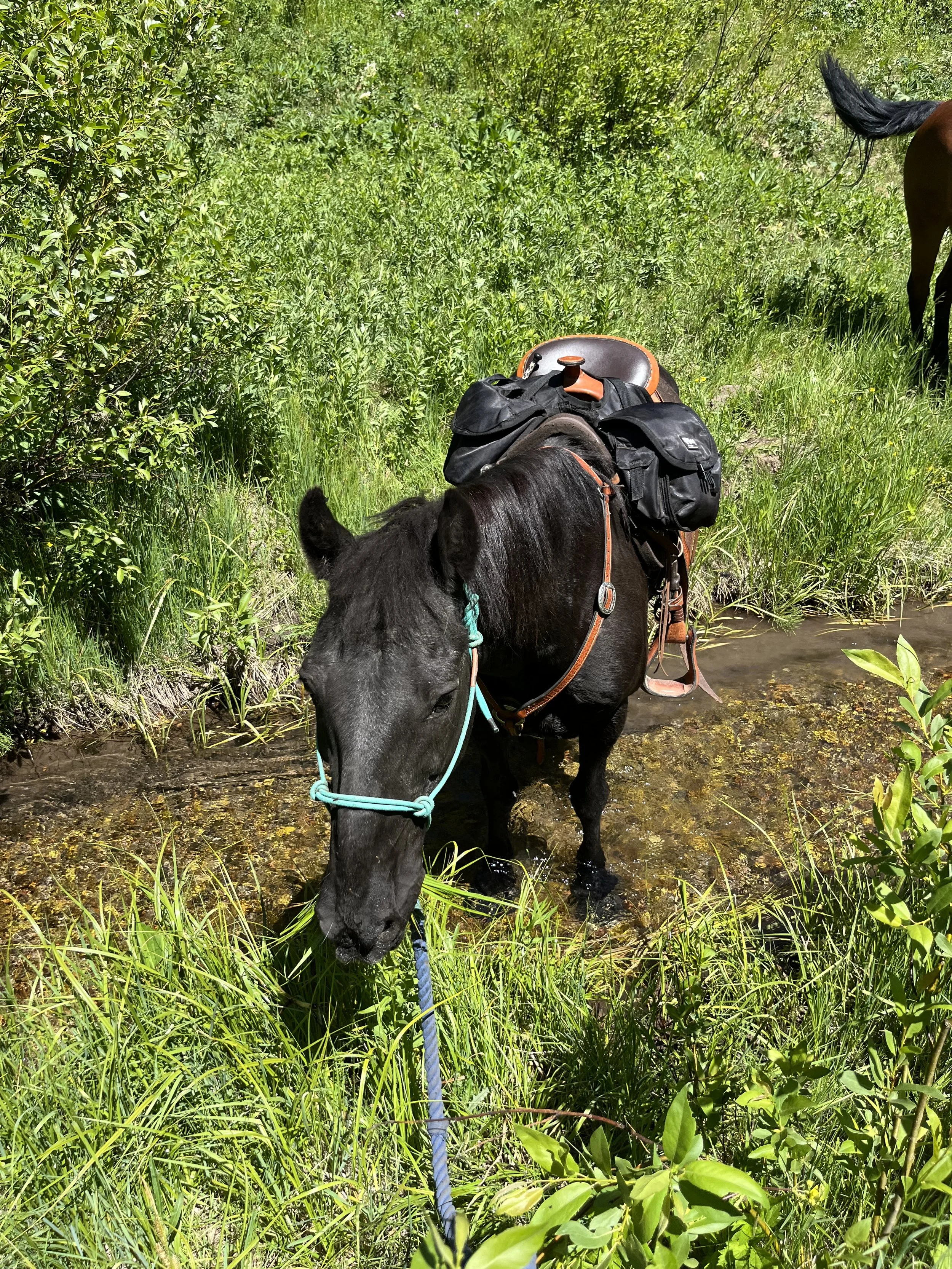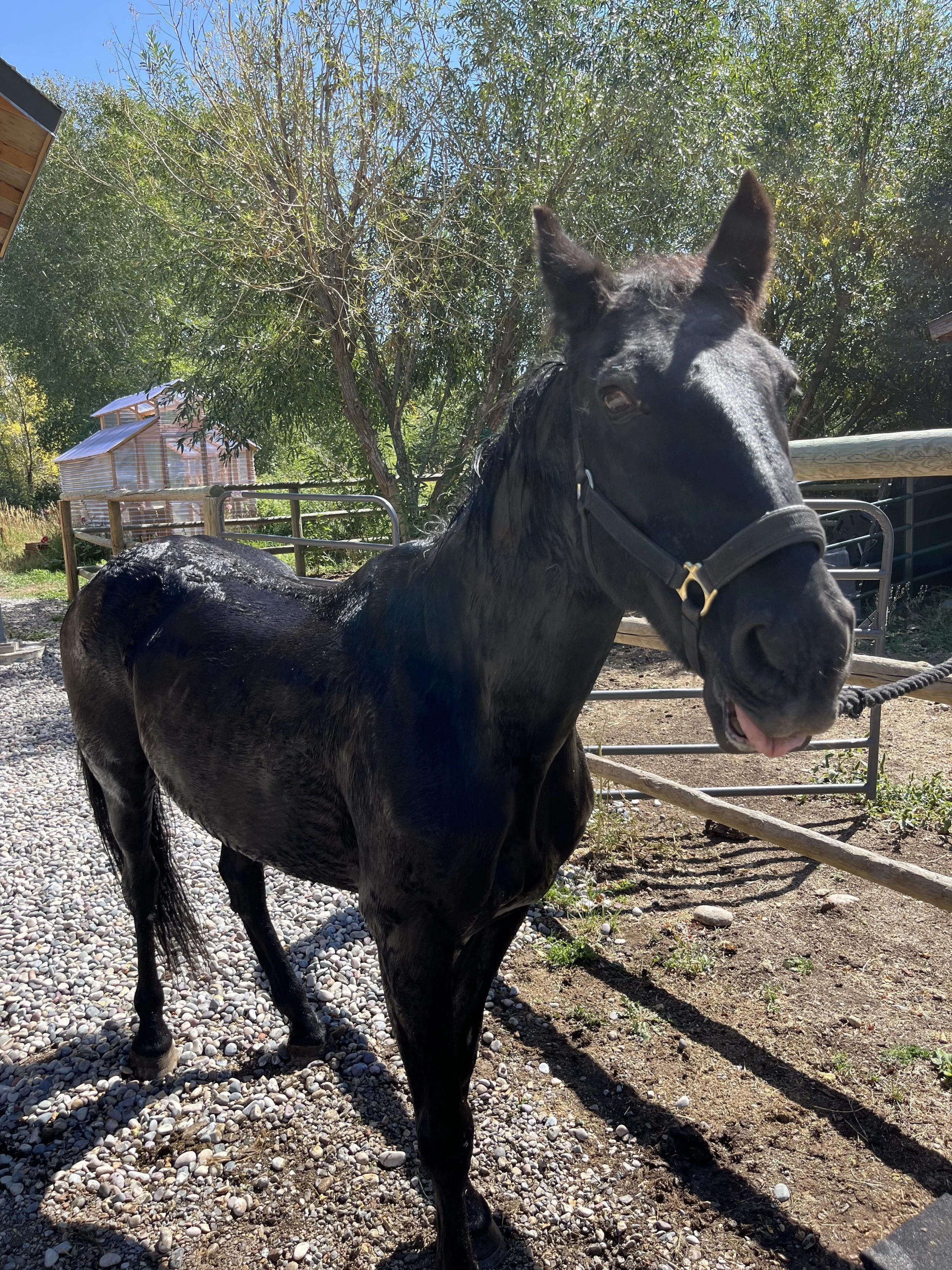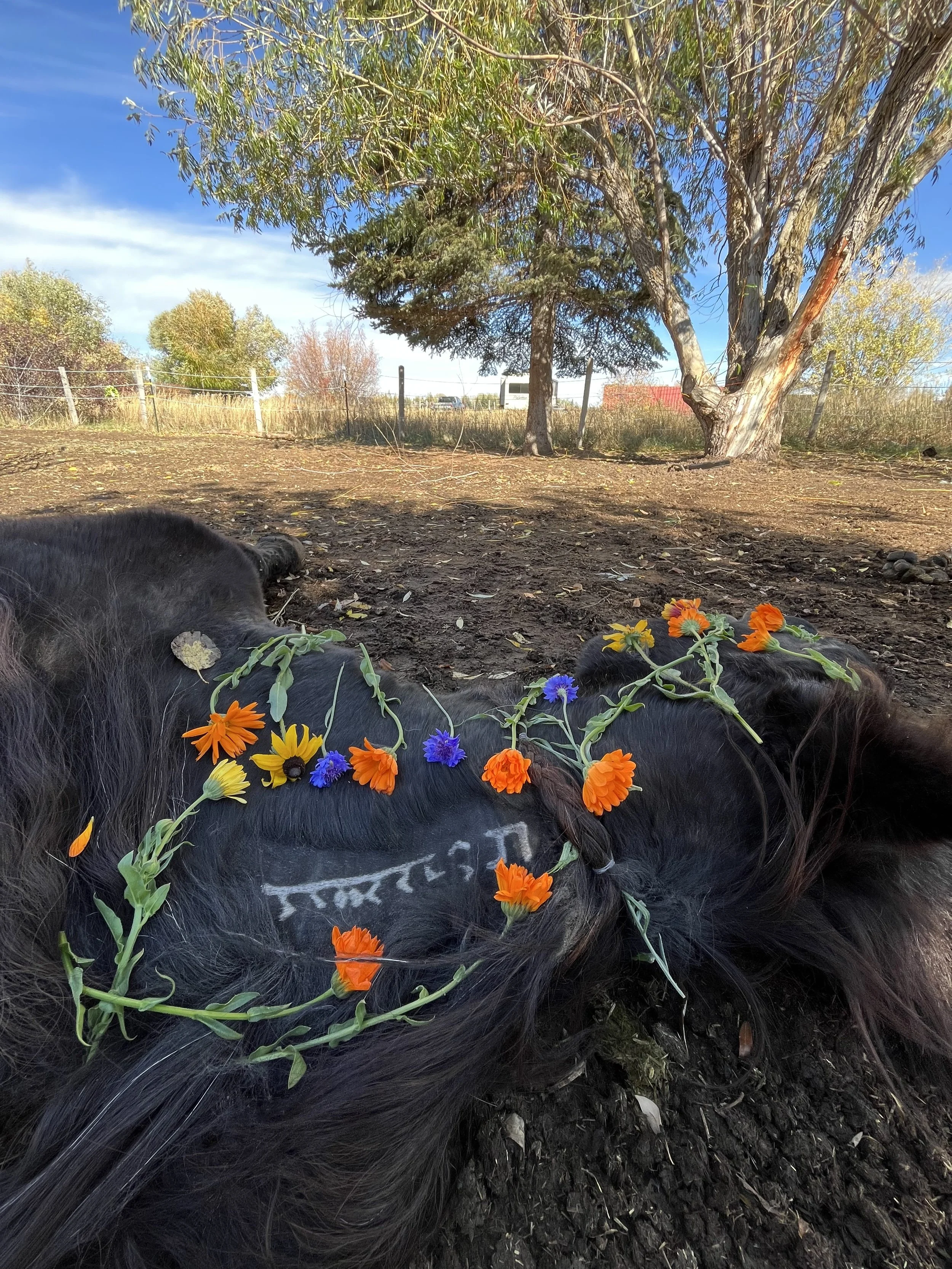 Gris was saved from the Colorado kill pen in December of 2023. After rescuing him, we looked up his freeze brand and it turns out he is from the famous Pryor Mountain herd in Wyoming and he was almost 30 years old! He is an absolute gem of a horse and a fan favorite at Wild Spirit Mustangs. He’s not only a giant sweetheart and an old soul, he also takes amazing care of the littles that take riding lessons on him. He’s been an amazing mentor horse to the younger horses in the herd and when he comes along on trail rides or pack trips. He went through a very serious bout of laminitis when he first came to Wild Spirit Mustangs due to his metabolic sensitivities but thankfully we were able to fully rehabilitate him and adjust his diet and management accordingly to where he’s now thriving. He enjoyed his last couple of years enjoying his well earned retirement and loved grazing side by side with his favorite mare Ruthie. We laid Gris to rest peacefully together with Ruthie on a warm, sunny fall day eating all his favorite snacks.